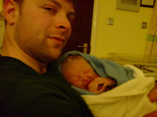 This is Zoe, just half an hour after being born, being kept warm in my arms.